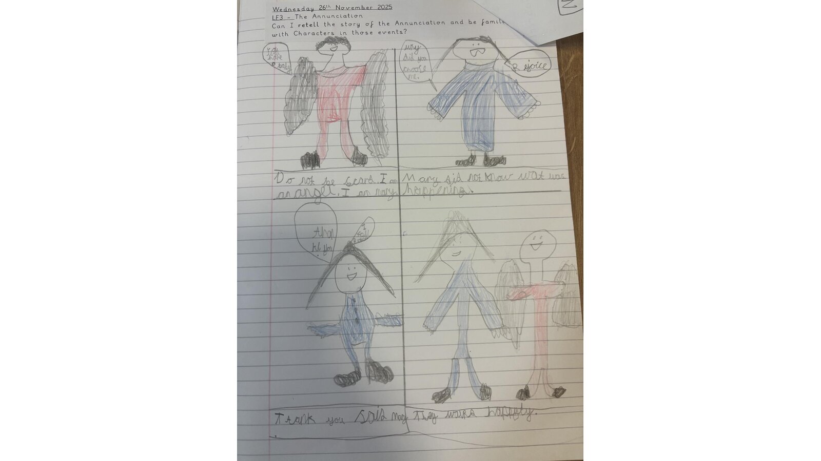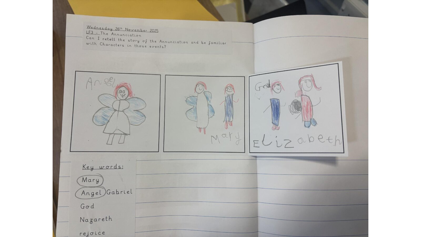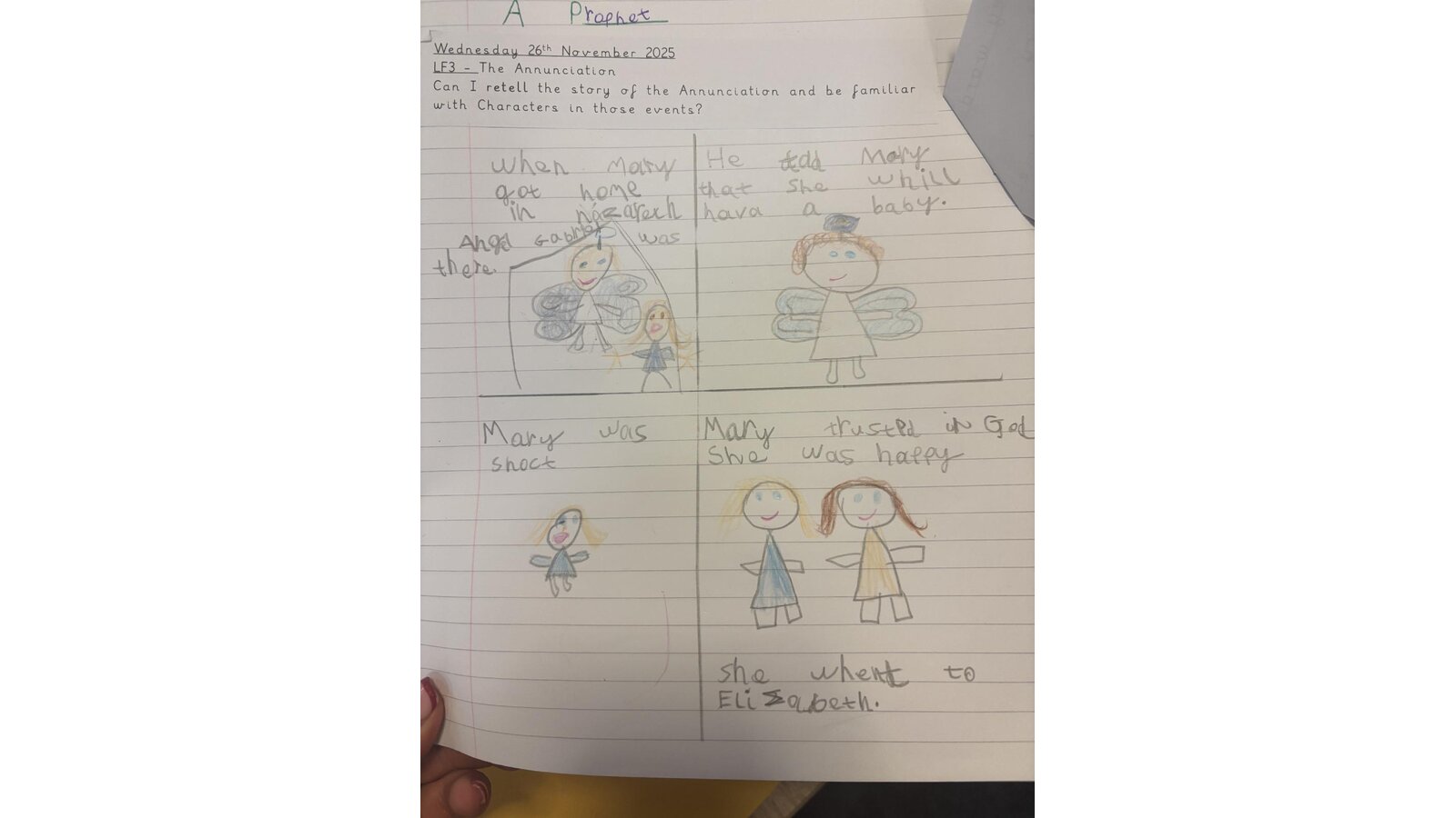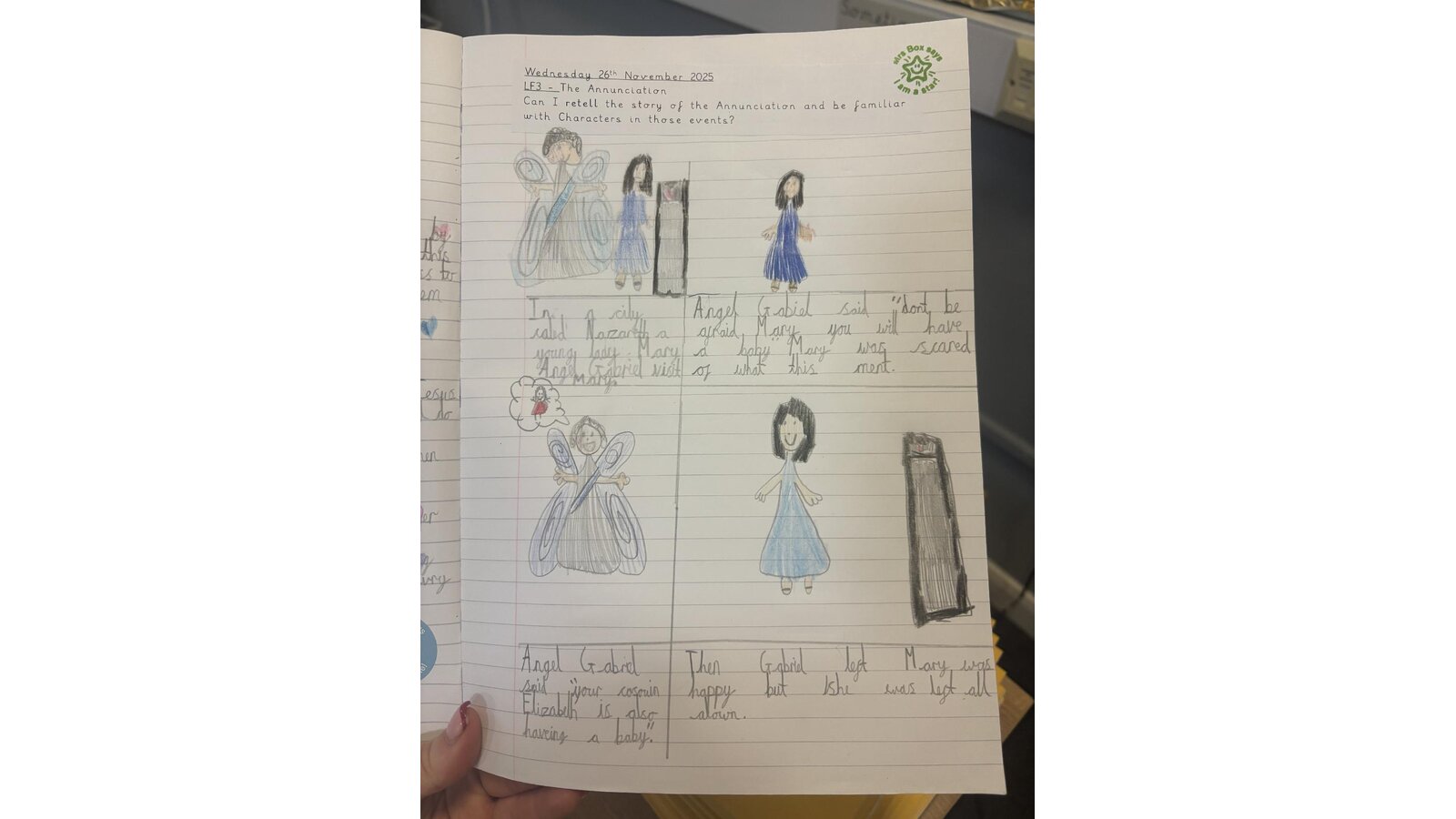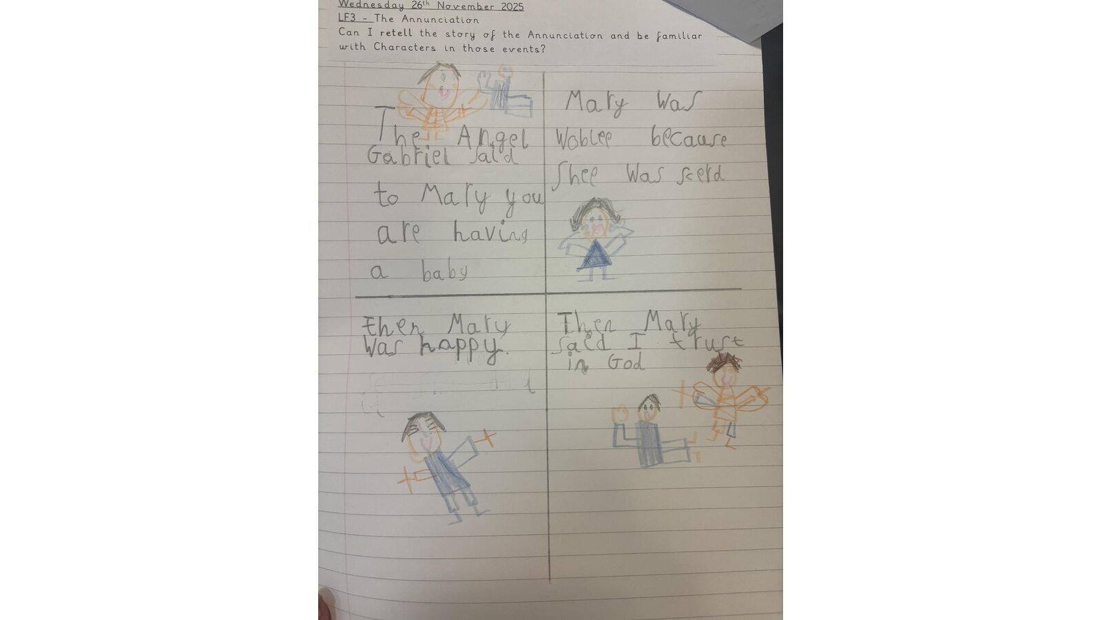 What a fantastic RE lesson I observed this week in Larks. The children were able to retell the Annunciation story using key vocabulary both in role play and in their written work. I was very impressed with the hot seating activity- inviting children to ask relevant questions and imagining how Mary must have felt when Angel Gabriel appeared. The children take so much pride with their RE work- it is a pleasure to look at and read. Well done boys and girls and of course Miss Holywell.
